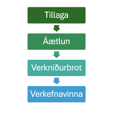 Verkefnið er hlutað niður í smærri verk, hvert með sinn ábyrgðaraðili og tímaramma.